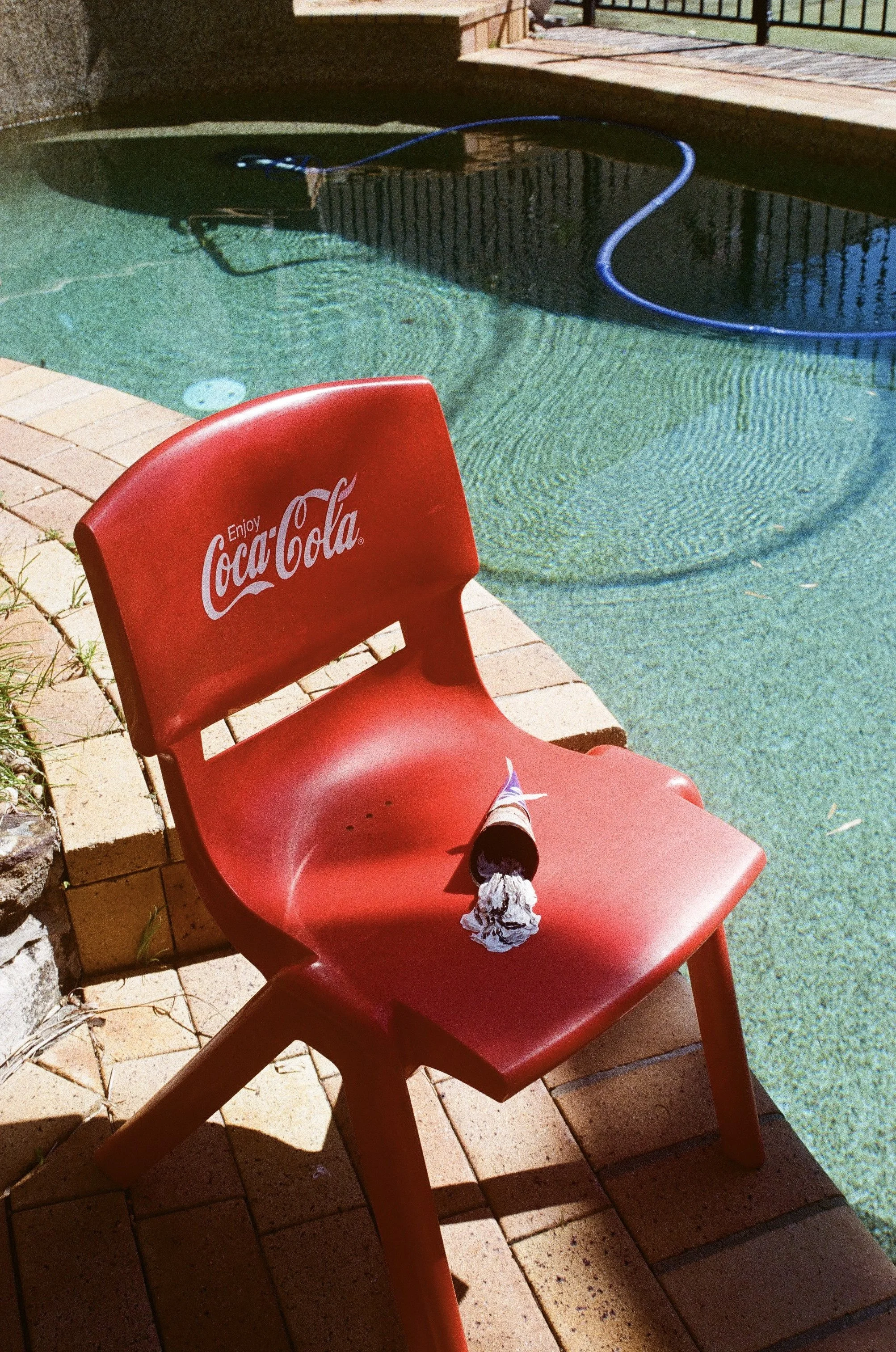 ‘Around the pool #2’ 2023, acrylic thickener, acrylic, recycled cardboard and paper ice cream cone on ‘Coca Cola’ branded chair - installation work